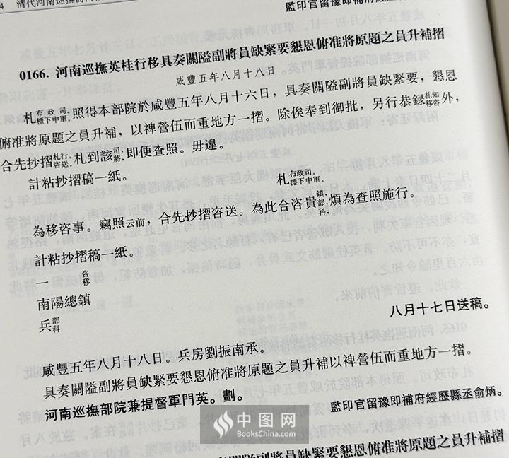 ★咸丰元年(1851年)至同治四年(1865年)间的军务政务档案内容涉及:(1)军务,包括“豫军”及他省军队在鄂北、豫东、豫南堵截太平军,在皖北助剿捻军,在河南清剿捻军和“土匪”等情况;(2)河南的雨雪粮价;(3)河南地方案件的审理情况;(4)河南各地组织团练、保甲、募兵以及军队的武器、军饷供应情况;(5)河南的灾赈情况;(6)河南的驿站情况:(7)河南的狱政情况;(8)河南的赋税和陋规的征收情况