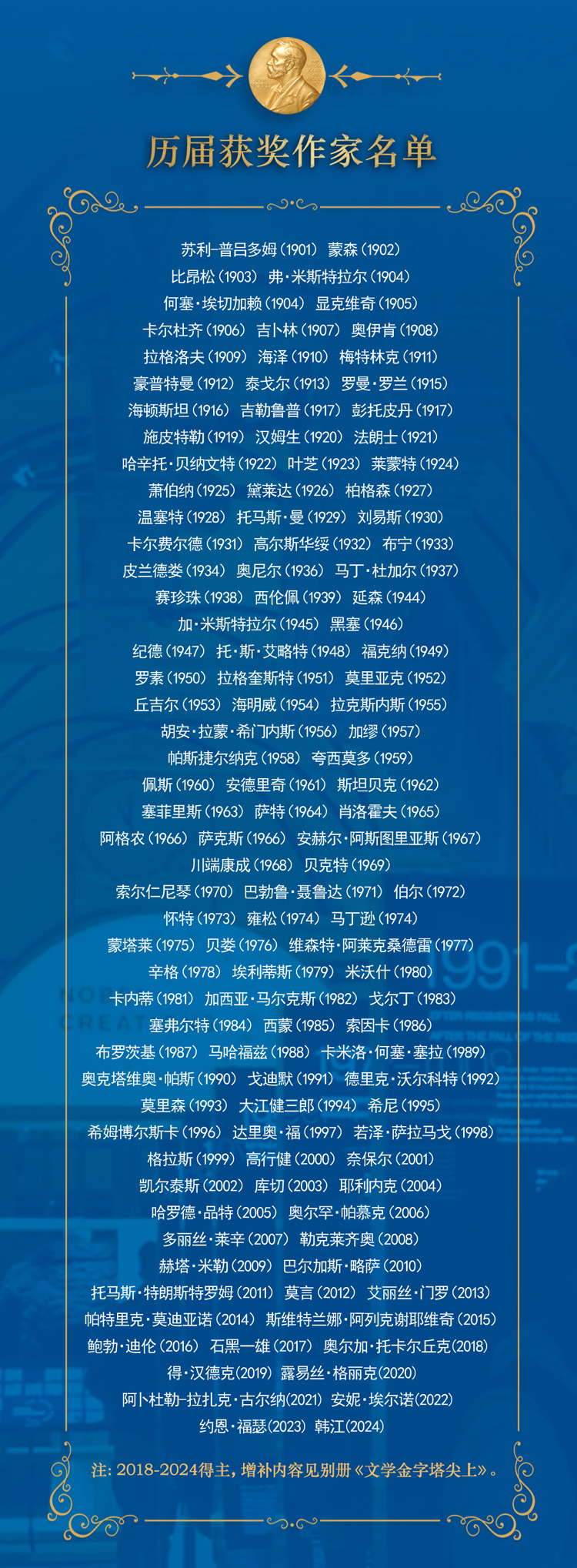 ★其中2018-2024年的内容被收录在别册里,别册是主书内容的增补和扩展,内容分为两部分,一是2018-2024年得主传略、授奖词、获奖演讲、成长经历、创作历程等,二是诺奖百年影像和发展历程,包括诺奖设立、评选和颁奖知识,以及台前幕后许多鲜为人知的史料和趣谈