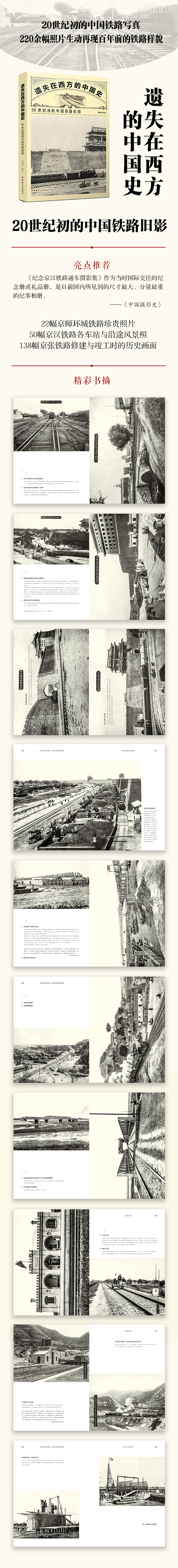 《20世纪初的中国铁路旧影》分为1917年《京师环城铁路工程摄影》、1905年《纪念京汉铁路通车摄影集》、1909年《京张路工摄影》和附录四部分,220余张照片涵盖车站、桥梁等工程细节,部分为首次公开。