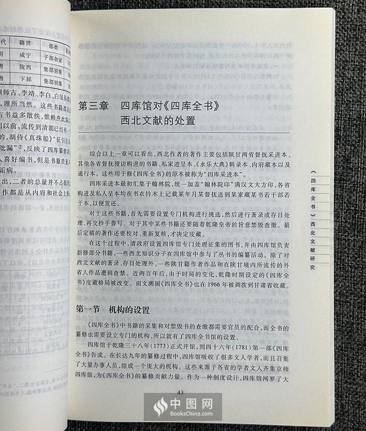 从清朝西北地区与《四库全书》纂修的关系,《四库全书》西北文献的来源,四库馆对《四库全书》西北文献的处置,《四库全书》西北作者及文献简介,《四库全书》西北文献存世情况,《四库全书》西北文献在《四库全书》体系中的地位和价值,非西北作者的西北文献等方面,对清修《四库全书》与西北地方文献的关系进行了全面系统的勾稽与研究,有发凡起例的功效。